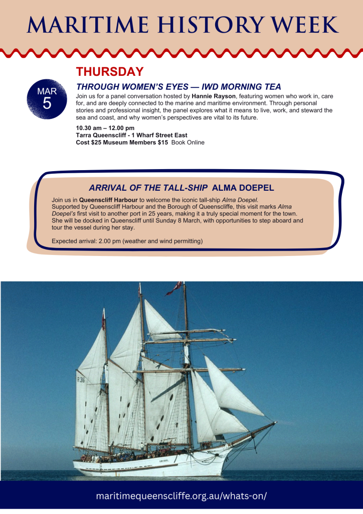 Join us in Queenscliff Harbour to welcome the iconic tall-ship Alma Doepel.